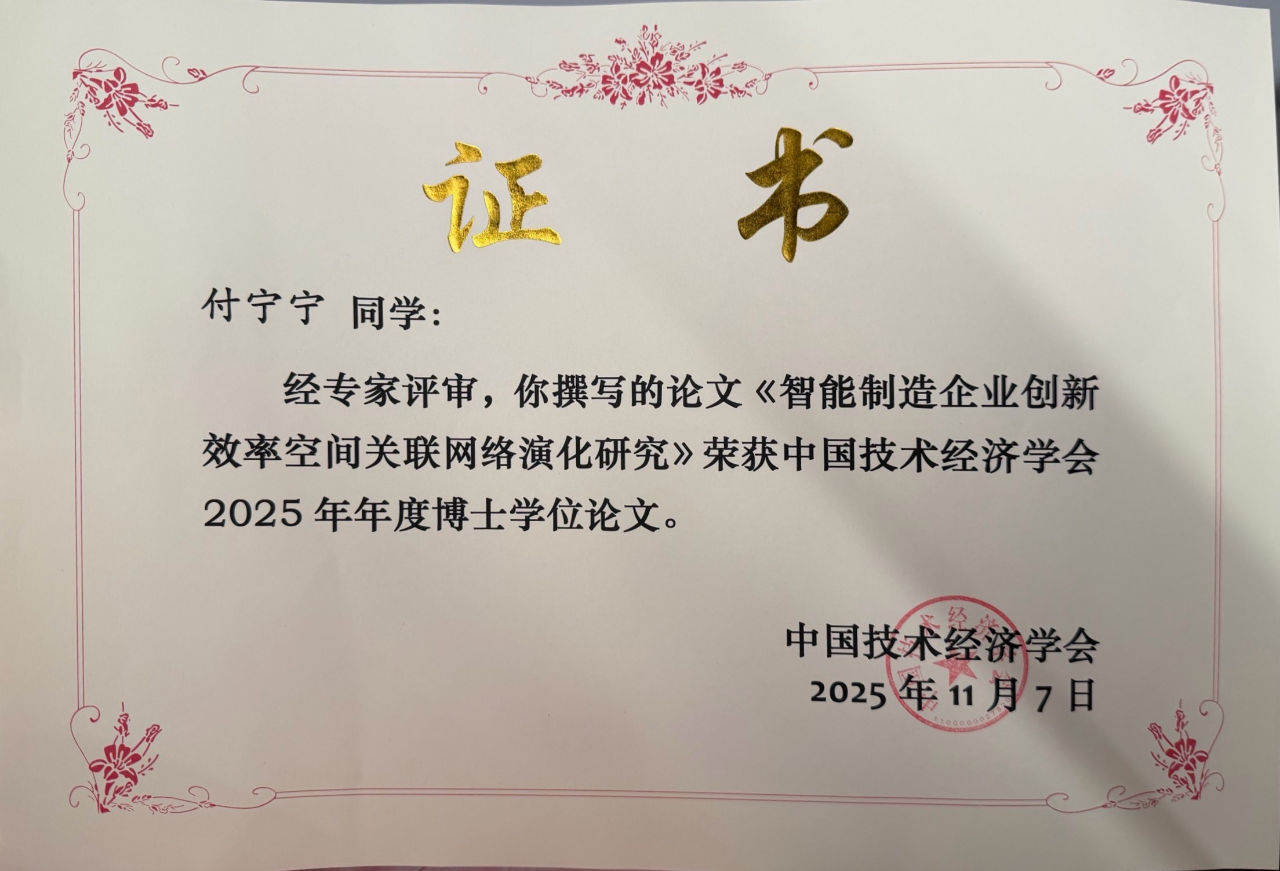 近日,中国技术经济学会第三十二届学术年会在浙江工业大学(杭州)隆重举行。本届年会由中国技术经济学会与浙江工业大学联合主办,主题为“人工智能驱动新质生产力跃迁和治理变革”。会议期间,我校管理学院付宁宁老师撰写的《智能制造企业创新效率空间关联网络演化研究》经过多轮严格评审,从全国众多高水平参评论文中脱颖而出,荣获中国技术经济学会2025年年度博士学位论文奖,实现了我校在这一权威评选中新的突破。