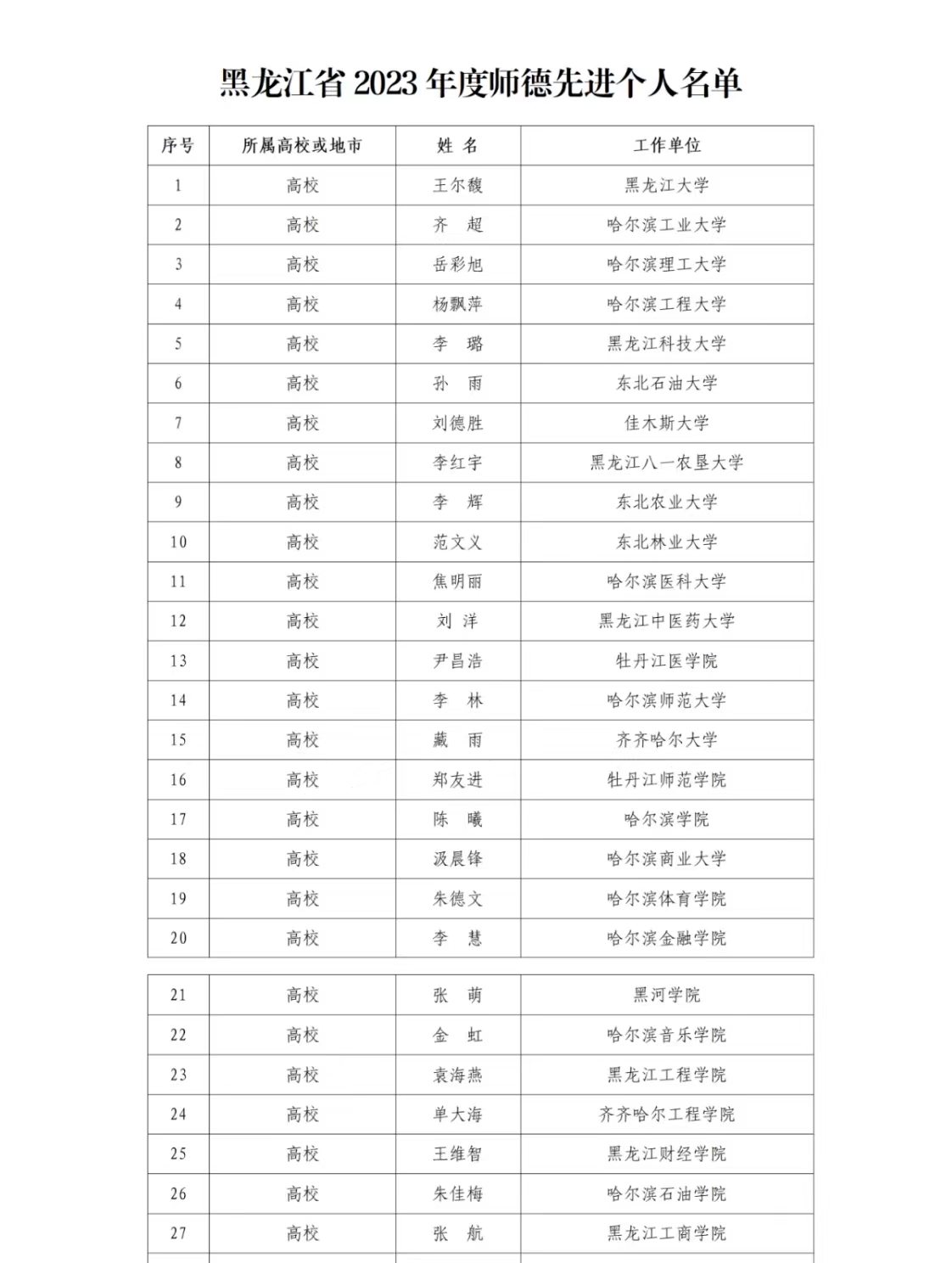 我校教师李慧喜获“黑龙江省师德先进个人”荣誉称号