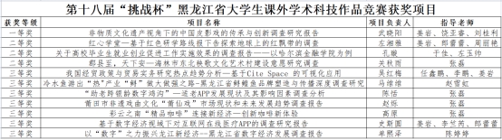 近日,由共青团黑龙江省委、黑龙江省教育厅、黑龙江省人力资源和社会保障厅、黑龙江省科学技术协会、黑龙江省学生联合会共同举办的第十八届“挑战杯”大学生课外学术科技作品竞赛省赛落下帷幕。我校在比赛中表现优异,荣获一等奖1项、二等奖3项、三等奖7项。其中,“非物质文化遗产视角下的中国皮影戏的传承与创新调查研究报告”入围国赛,我校荣获大赛“优秀组织奖”。